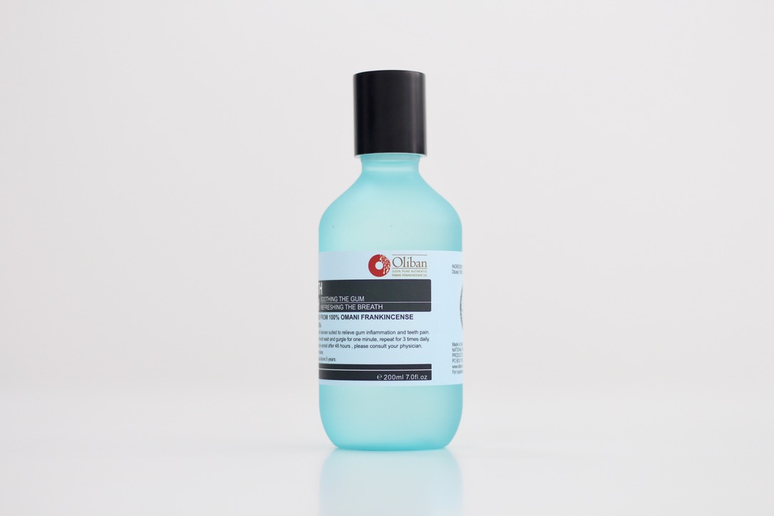 بإستخلاص زيت اللبان العماني النقي والذي يحمل الخصائص المضادة للالتهاب. فإن غسول الفم المنعش يعطيك شعورا مليئا بالإنتعاش ورائحة الفم الزكية بعبق اللبان، كما يساعد على تخفيف التهابات اللثة والام الأسنان