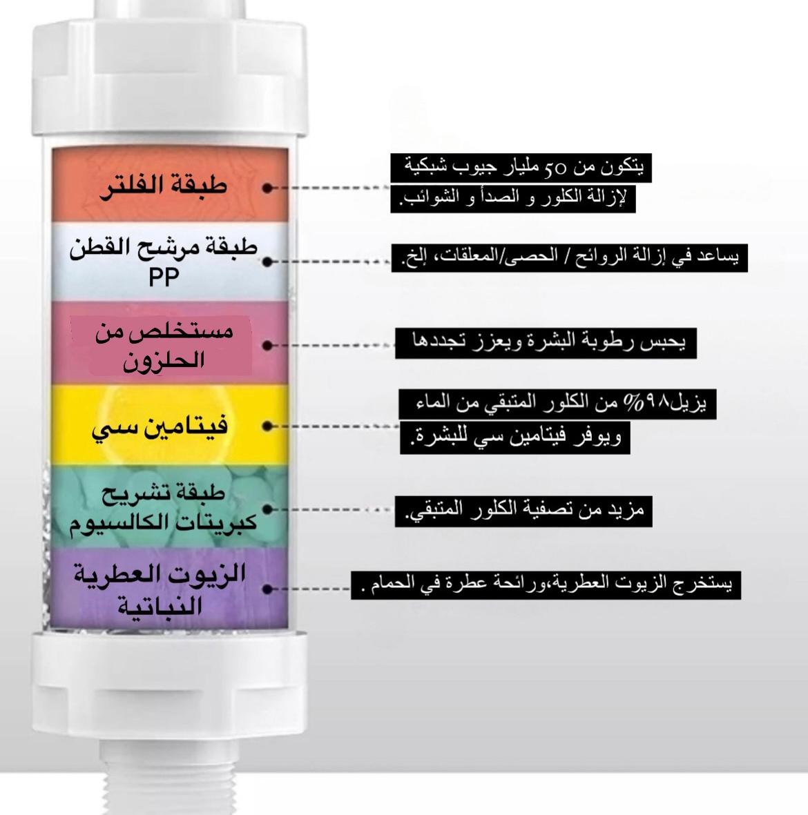 يعتبر هذا الفلتر وسيلة فعالة وآمنة للتخلص من الشوائب العالقة بماء الاستحمام كالأتربة والصدأ بالإضافة إلى الكلور الذي من الممكن أن يعرض شعرك وبشرتك للكثير من المشاكل.