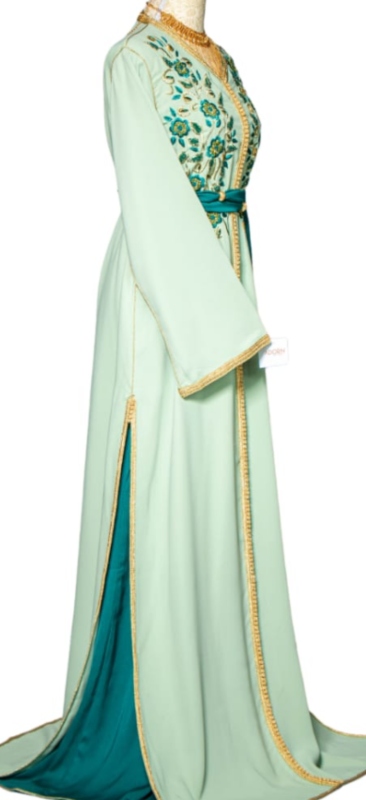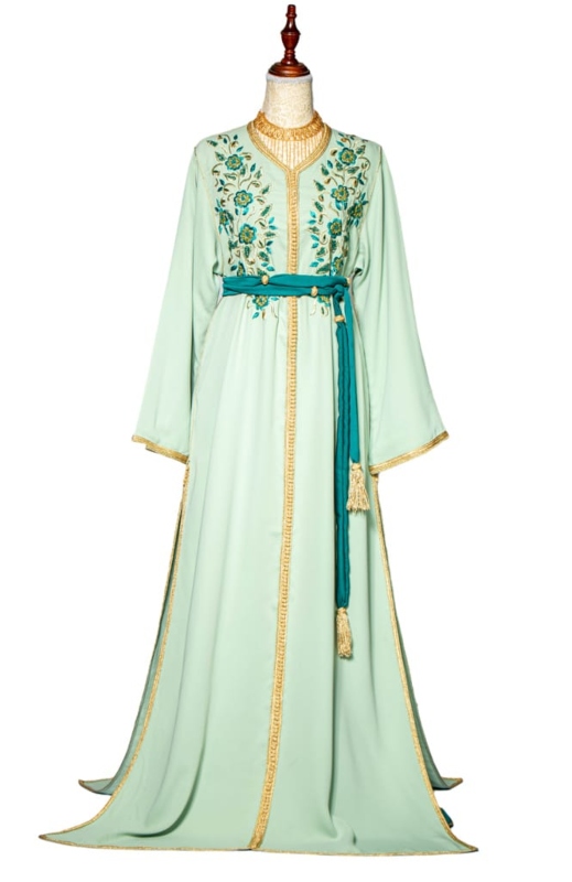 قفطان كريب ناعم مكون من قطعتين مطرز باليد و مطعم بالأحجار مع حزام القياس: M/L F002