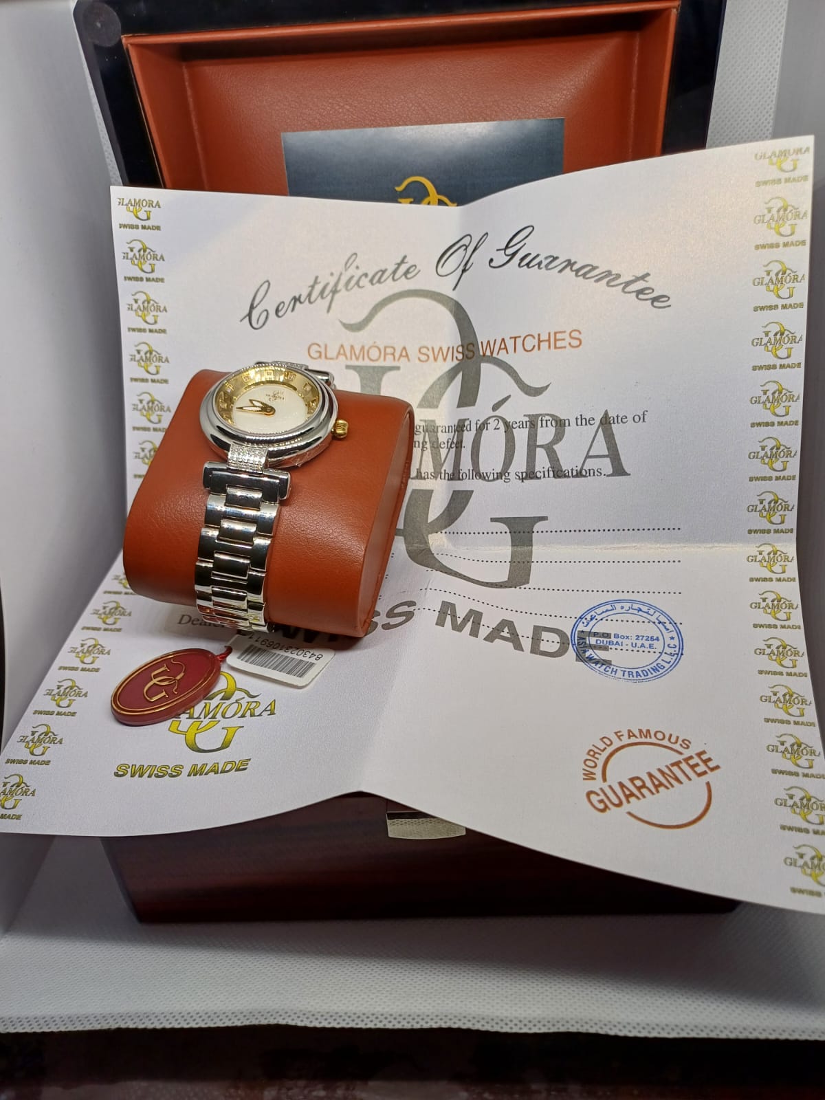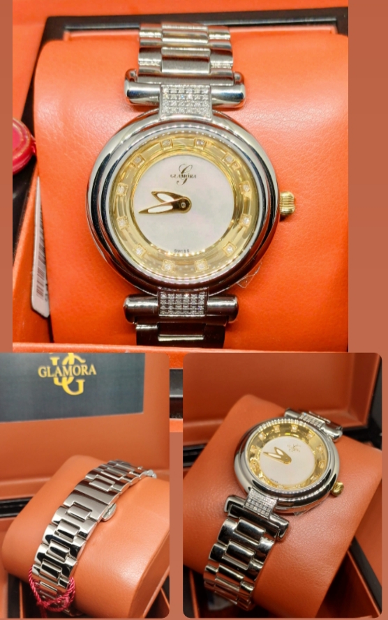 ساعة جلامور السويسرية للمناسبات مرصعه ب 60 حبة ألماسوزن 0.30 قيراط قياس 34 مم بكافة المرفقات