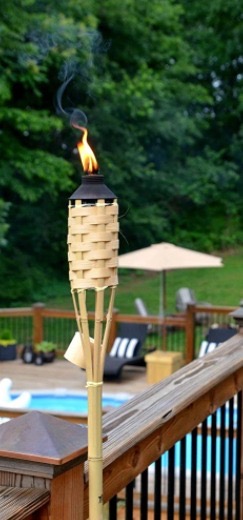 مشاعل خشبیة مصنوعة یدویا من البامبو مزودة بغطاء یسھل عملیة إطفاء الشعلة ، مزودة بوعاء معدني أسود توضع به كمیة مناسبة من زیت المصابیح تعادل ١٧٠ ملم ، یتم امتصاصها بفضل الفتیلة المصنوعة من القطن، سھلة الحمل ، المشاعل متوفرة بطول ٦٠ سم (العرض غير شامل زیت المصابيح)