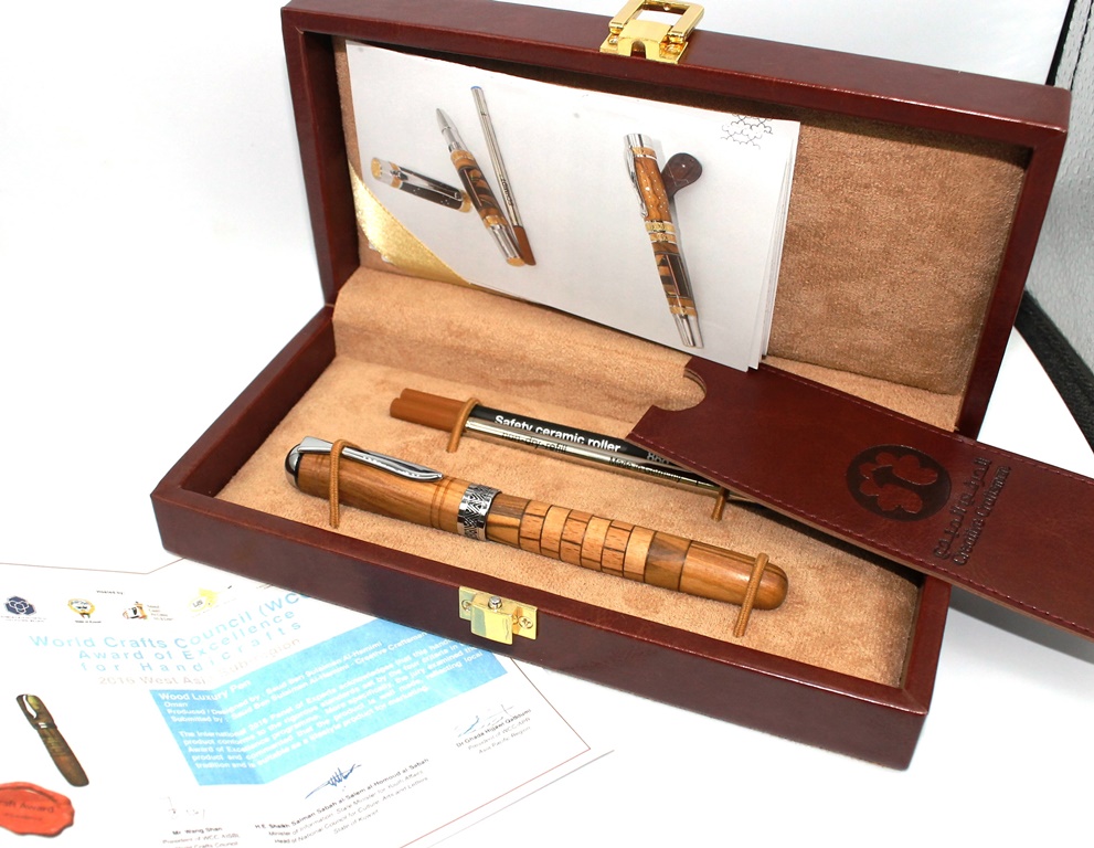 القلم الحائز على جائزة مجلس الحرف العالمي عام 2016م والمقامة في دولة الكويت .. تم تصنيعه من خشب شجرة العتم مع نقشة من خشب شجرة الزان وخشب الساج ( يتوفر شهادة معتمدة للقلم ) صنع يدويا باستخدام أخشاب عالية الجودة مع تلميعه بمواد صديقة للبيئة محضرة منزليا من مواد طبيعية .. يتميز القلم بملمس ناعم وبلمعان يظهر مدى جودة العمل .. يأتي مع صندوق مصنع يدويا من الجلد الماروني مع محفظة من الجلد الماروني لحفظ القلم من التعرض للخدش .. نفتخر بعملنا ونتعامل مع كل قطعة نعملها كعمل فني .