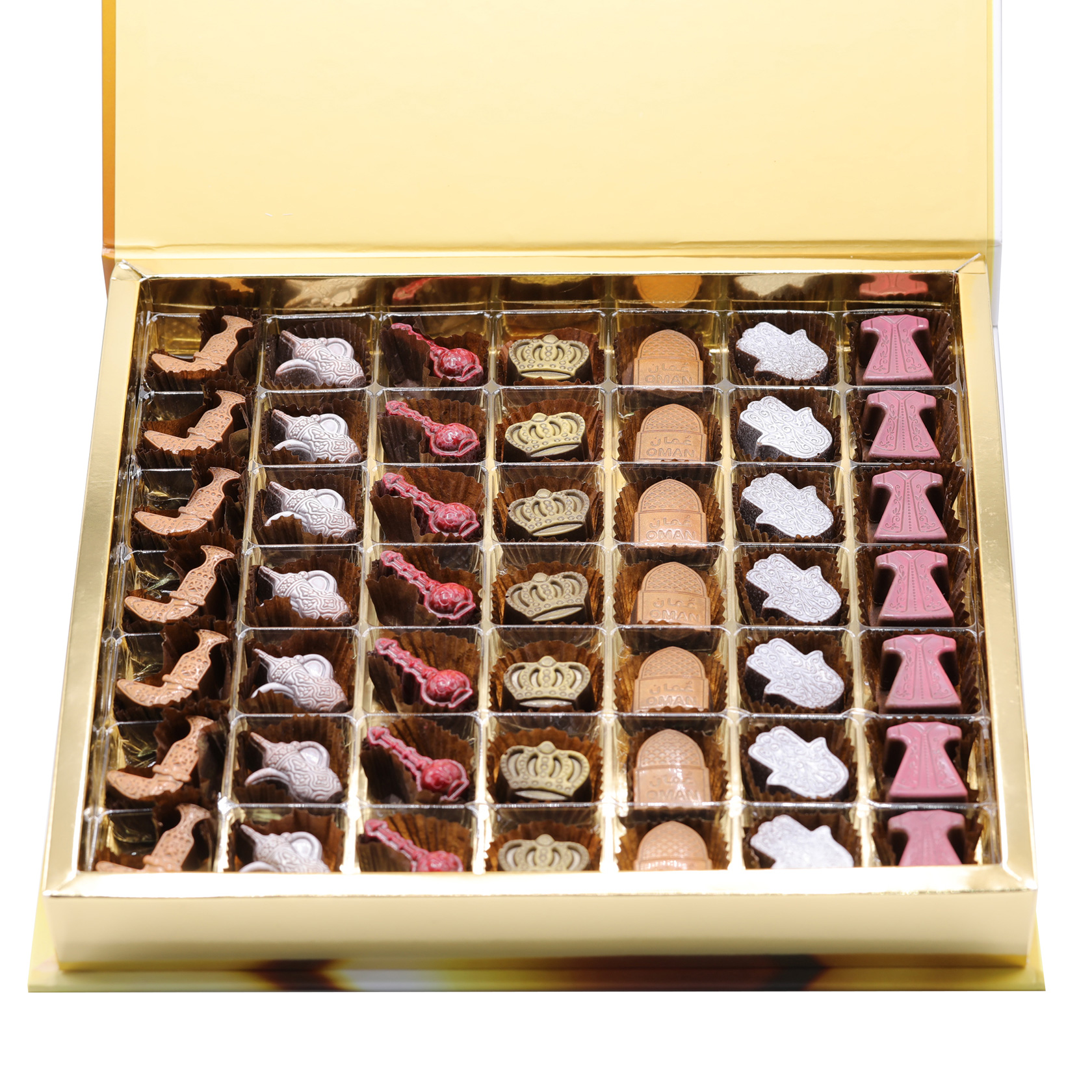 متوسط عدد القطع في علبة شوكولاتة المذاق العماني تقريباً 50 قطعة. مجموعة المذاق العماني تحتوي على أكثر من 12 نكهة وشكل، ما سيصلك سيكون من نفس المجموعة الذي قد يتضمن بعض الاشكال في الصورة.