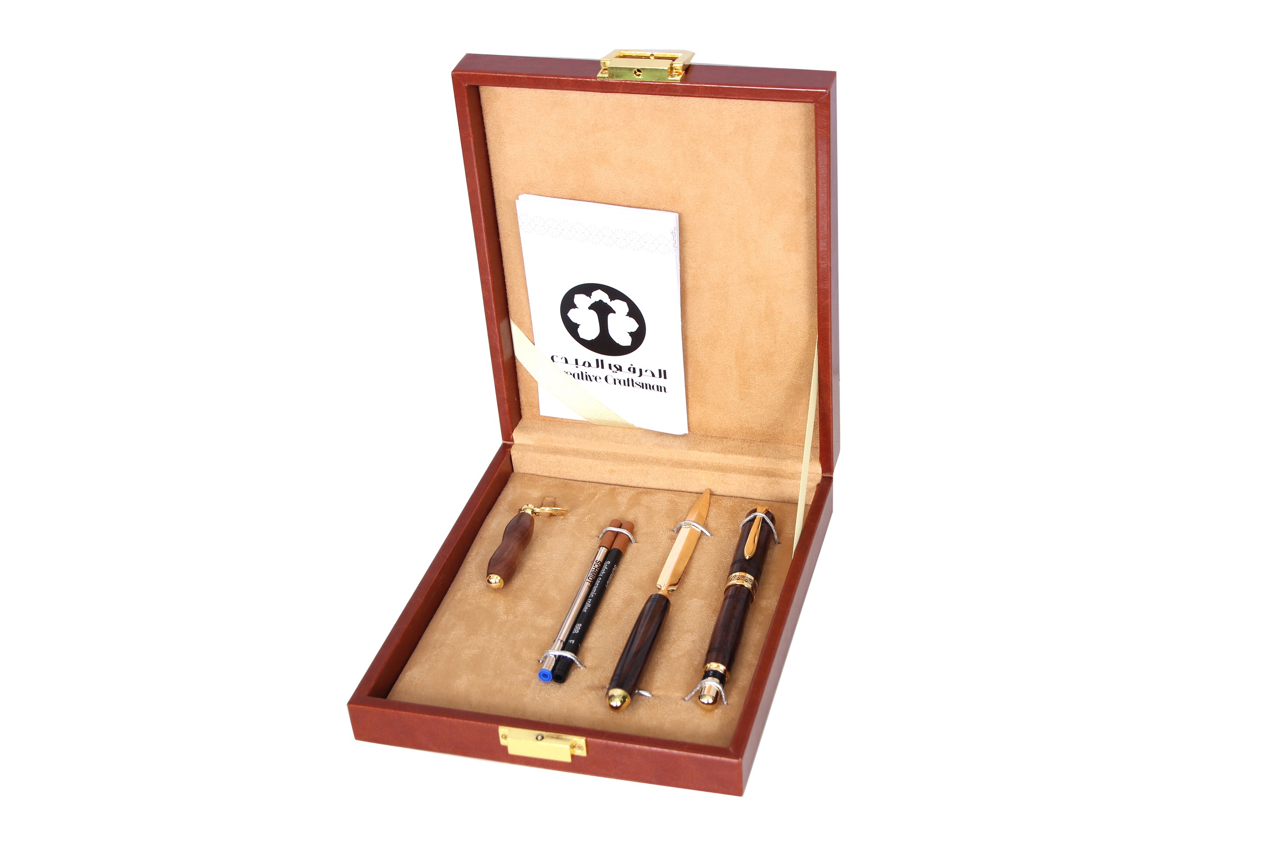 طقم أقلام مصنع من خشب الورد Rosewood مكون من قلم مع فتاحة أظرف مع ميدالية تم تصنيعه يدويا باستخدام أخشاب عالية الجودة وذات صلابة عالية مع تلميعه بمواد صديقة للبيئة محضره منزليا من مواد طبيعية .. تتميز القطع بملمس ناعم وبلمعان يظهر مدى جودة العمل .. يأتي مع صندوق مصنع يدويا من الجلد الماروني .. نفتخر بعملنا ونتعامل مع كل قطعة نعملها كعمل فني.
