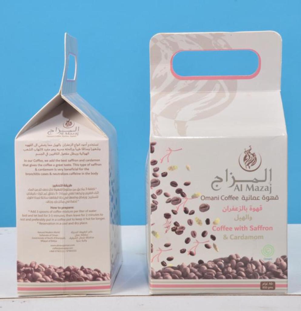 علبة بها كيس مسلفن به قهوة محضرة من اجود انواع البن مخلوطة بأفضل أنواع بالهيل بالزعفران وقد تم سحب الهواء من الكيس من أجل الحفاظ على جودة القهوة