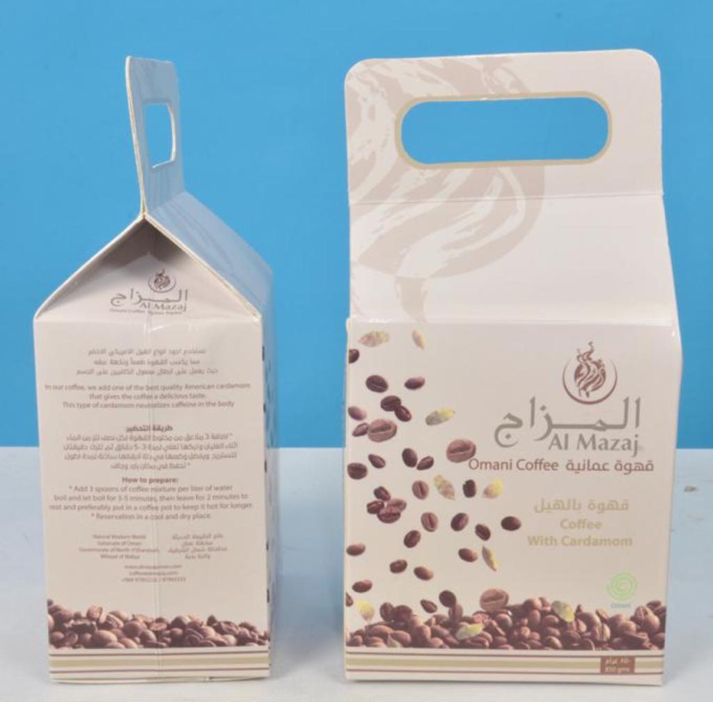 علبة وزنها ٨٥٠ جرام بها كيس مسلفن به قهوة مطحونة محضرة من افضل أنواع البن وأضاف إليها اجود انواع الهيل..وقد تم سحب الهواء من الكيس من أجل الحفاظ على جودة القهوة.