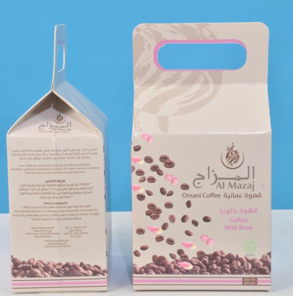 علبة قهوة عمانية مطحونة ومحضرة باجود أنواع حبوب البن مخلوطة بالورد وقد وضعت داخل كيس مسلفن وتم سحب الهواء للحفاظ على جودة المنتج.